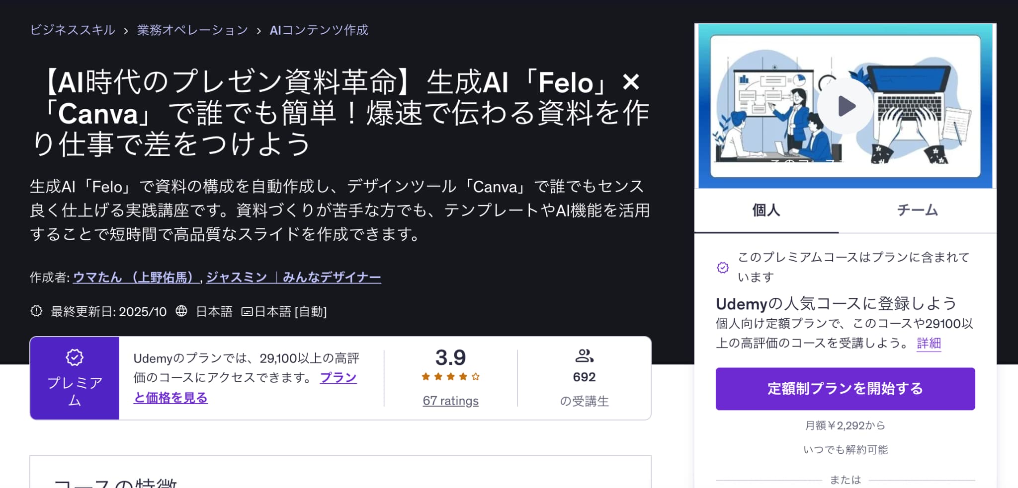 以下の僕自身が友人と共同開発したUdemy講座ではFELOとCanvaを組み合わせた資料作成について解説していますので、ぜひチェックしてみてください!