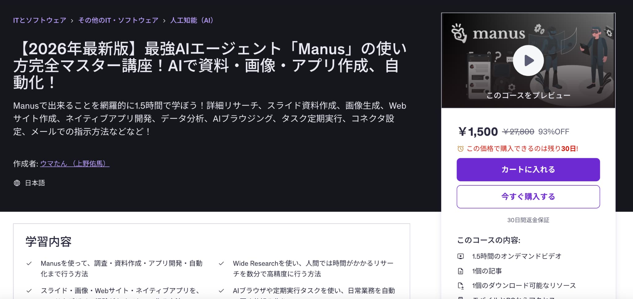 Manusに関しては以下のUdemy講座で詳しく解説しているので興味のある方はぜひチェックしてみてください!
