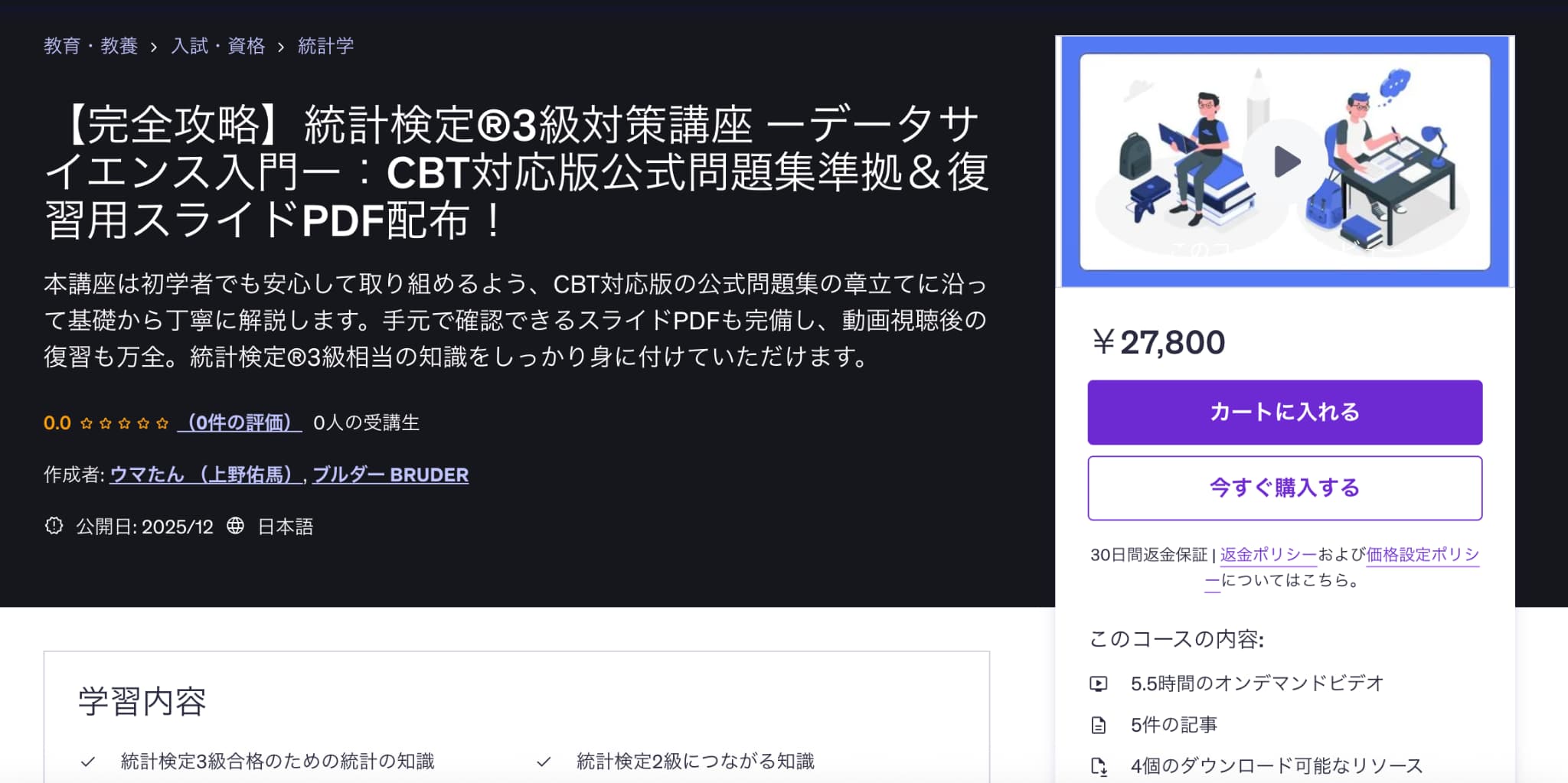 また、体系的に統計検定3級合格のための知識を学びたい方は、以下のUdemyコースでまとめておきましたので是非チェックしてみてください!